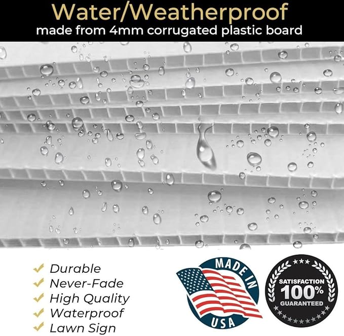 - ππππ ππππππππ: Made from premium weather-resistant corrugated plastic, our signs are designed to withstand a variety of weather conditions while maintaining their brightness and durability. Designed for both indoor and outdoor use, they stand out over time, no matter the environment.